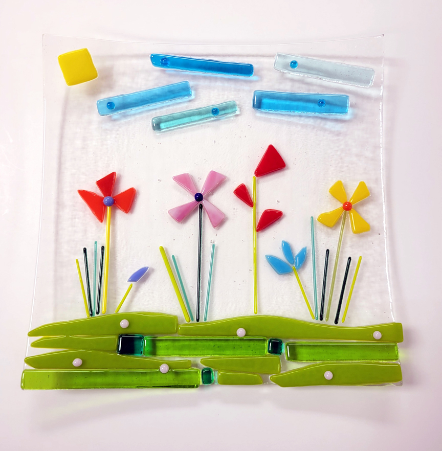 You’ll use our precut shapes to create your own design in a 8″ x 8″ glass piece that can be left flat or slumped to use as a bowl.