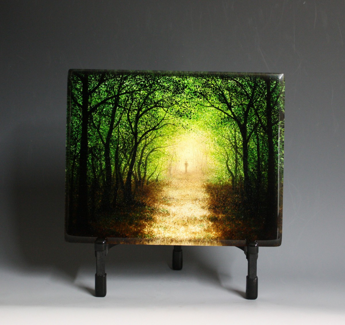 I just finished a new group of smaller (8x10x1) frit paintings that I wanted to share. I'm focusing on the mood of the landscapes, as well as more detail.