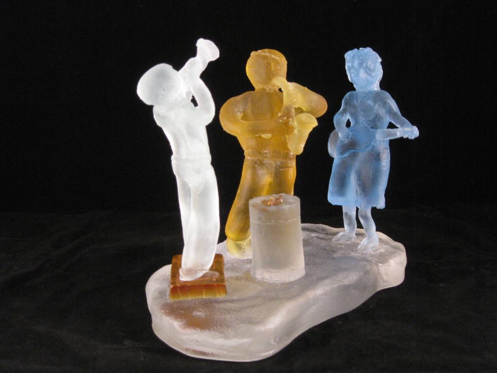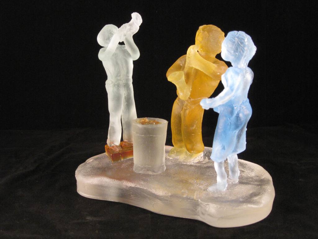 Each of the characters, the barrel and the box are cast individually, then placed onto a wax base, reinvested, wax out, clear glass in.... so the piece is one solid piece, no glue. Tim