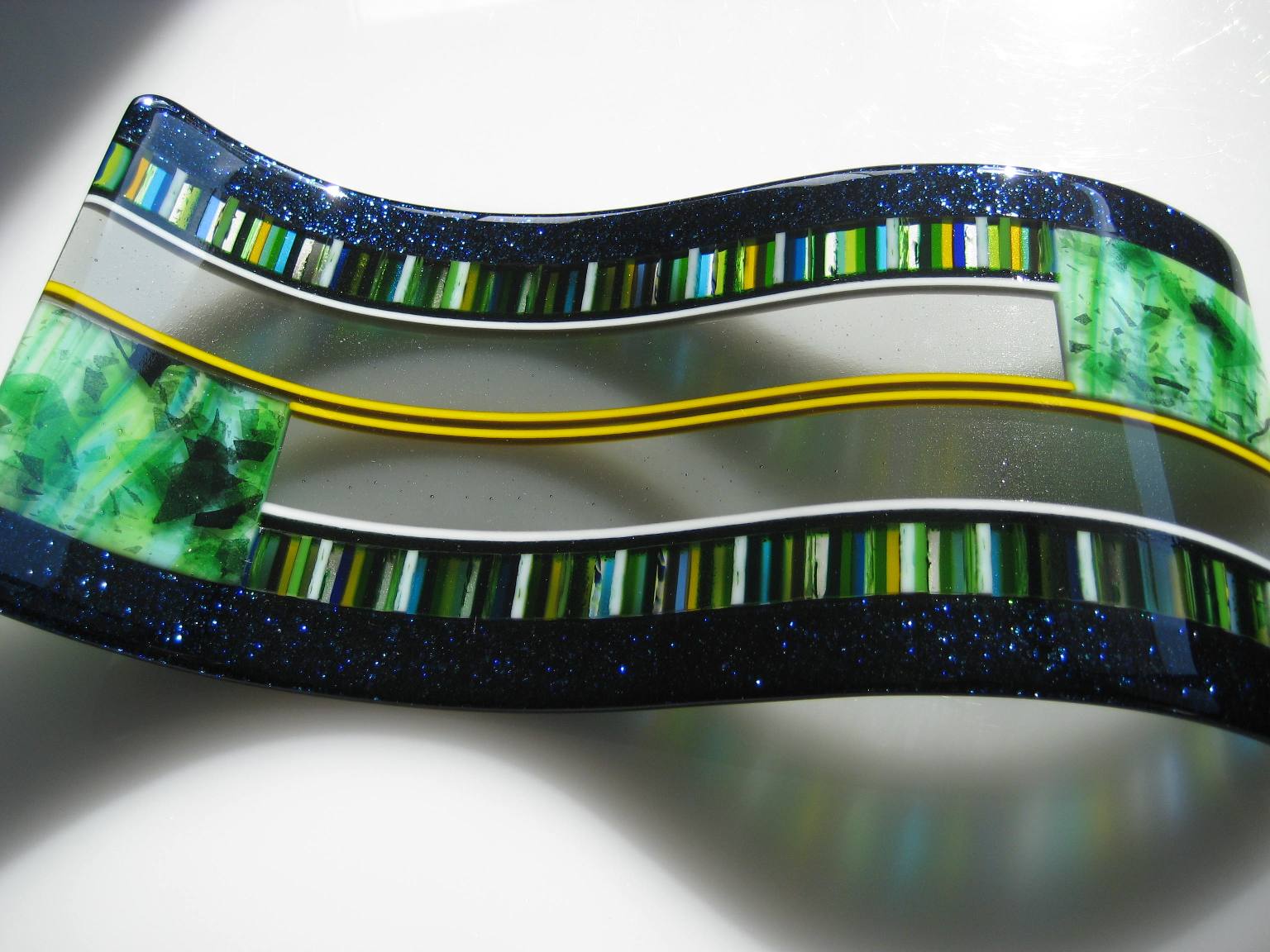 I like the blue aventurine shoulders, and the bubbles in the transparent road. The photograph works well too, as you displayed the piece and its shadows as a new composition.