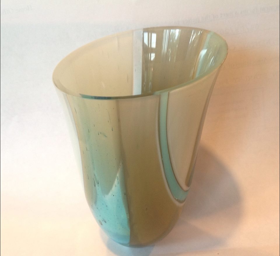 After much trial and error, I have a presentable drop ring vessel. I used 4 layers of glass, and it dropped about 5". 3 layers was sometimes just a little too thin. I like the feel of the heavier vessel with 4 layers, so I think I will stick with that. The colors remind me of the beach, so I am really happy with how it all turned out.