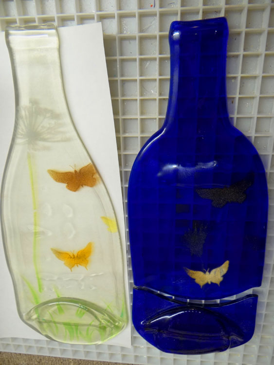 I have had success with this technique before, although can't figure out what I did differently then verses now. Here is an example on slumped bottles using coe 82 powders (one somewhat successful, one failure). I realize the breaking of the 2nd (cobalt) bottle was a ramp issue ... but what's causing the powders to 'char' and 'burn'? [BTW the bottles have only one layer of powders, unlike the Betty Boops.]
