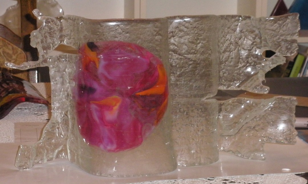 I would like to mention that the white line you see at the back of the piece is not a crack or a score . IT is what was the end of the mesh melt before. Under the heat and the weight of the clear glass, it spread , but it kept the previous 'border' of the melt. Perhaps had I sandblasted it - I would have been able to prevent this.