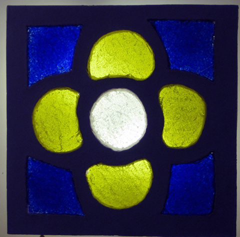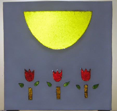 here is a tile that I made using terra cotta and glass. 30cm x 30cm x 25mm