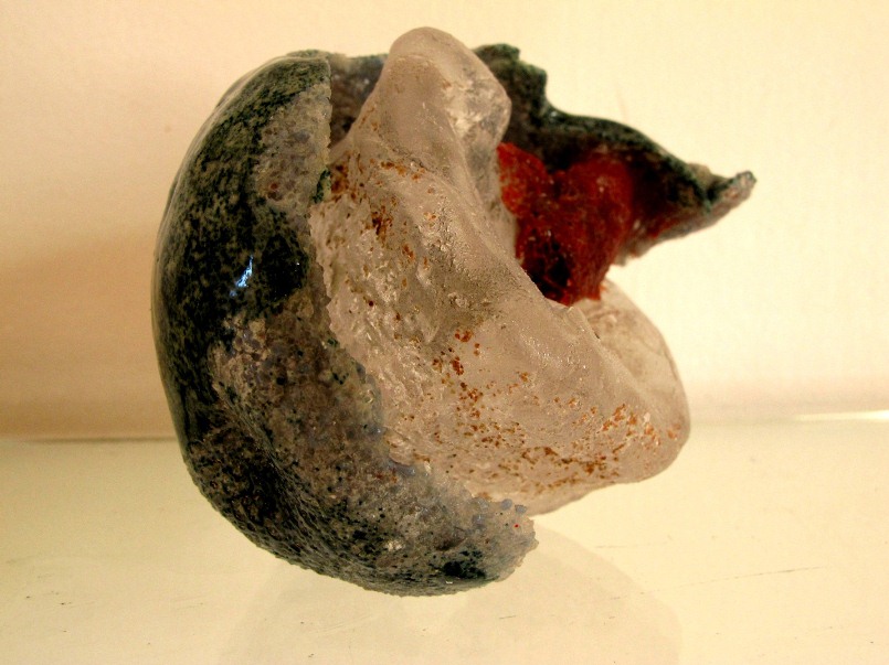 I made several tests: here is one of them. The white is a cast piece that which I surrounded with green red parts of pate de verre.