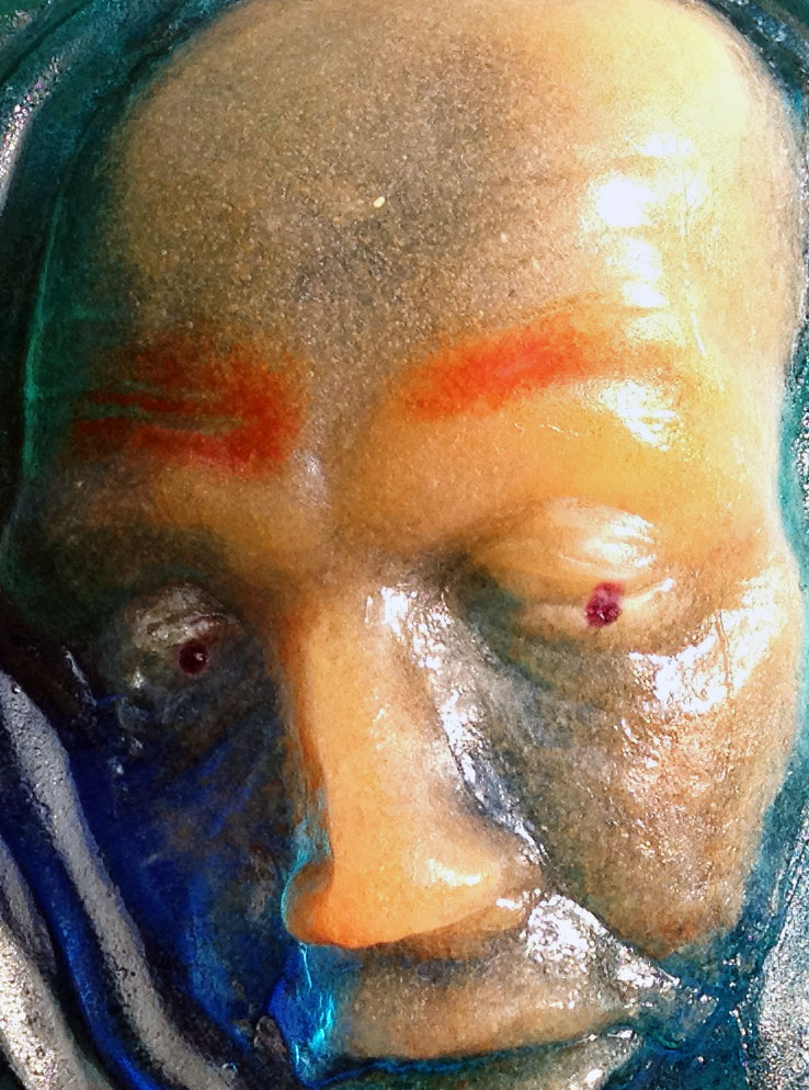 There were a few odd effects, though; the red-brown dusting I gave the eyebrows did migrate a bit, as did the pupils, and needed to be cold worked. Typically the pack doesn't move at all in my faces, so that was a little unusual. Also, the pate de verre WAS more translucent than usual, so that the strongest blues behind the face show through.