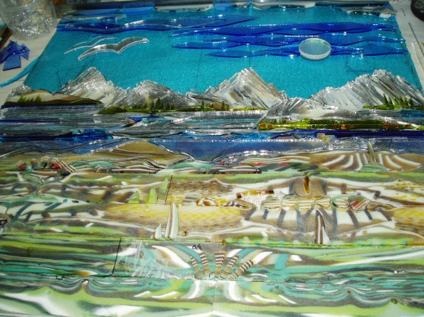One of 5 panels to be created at Uroboros Glass Company Residency in July! More layers of clear to go on this but transporting layers of cut pieces and the finished cut panel is a trick in itself. Had to get a PaPs Manifest done tooo so going over the border will be alittle easier this time I hope. I just wish it was not so hard to get into the USA but hey! my motto is do not sweat the small stuff. So off I go to finish the other panels before I arrive there as time will be short to fire and then slump this piece called: "WETLANDS SANCTUARY" . Look so forward to seeing a few of you while in Portland too! Leslie