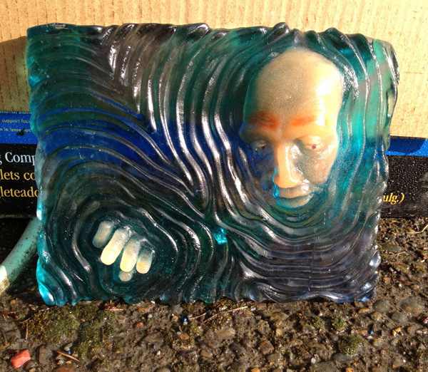 This is wet and dry pack frit for the fingers and face, billet casting for the background--the mold lifted off the billet perfectly and gave me the detail I wanted. The PdV areas tended to stick and had to be power-washed away. That's just the nature of the beast--fritcasts expose a lot more glass surface area to the mold, and if you're packing the powder against the mold surface you're both abrading and integrating the grains with any plaster coming off the mold.