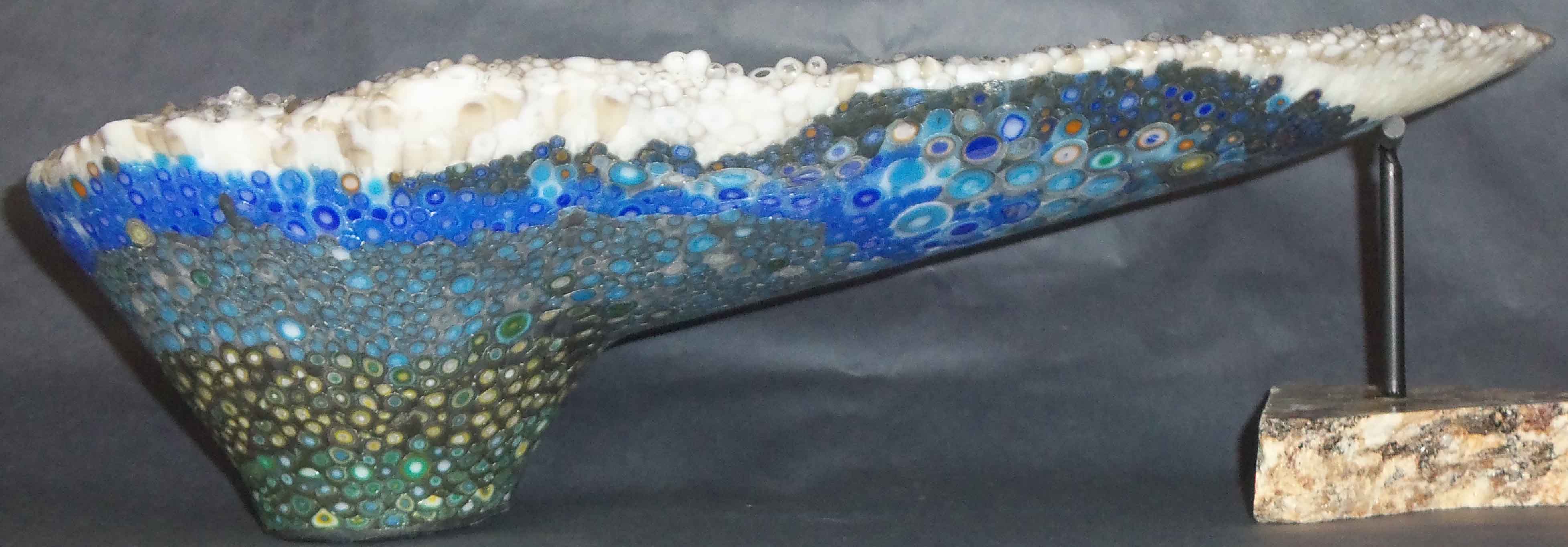 That shape is impossible to slump into. It has a deep foot at one end. Glass will fold up on itself as it slumps. Tried it with window glass first and it folded up. I actually had to fire the murrini 3 times. After the first fire the sides settled down as the air space disappeared between the individual murrini and I added more rows to top up. Had to do that a second time for a total of 3 firings.