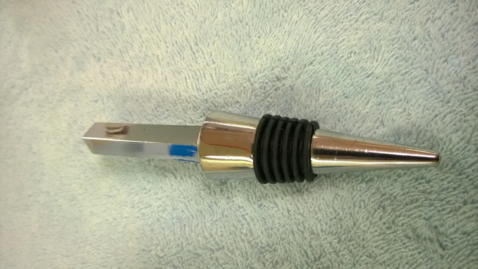 drill a v hole in a bottle cork to go over the metal and then glue a fused glass piece to the cork?