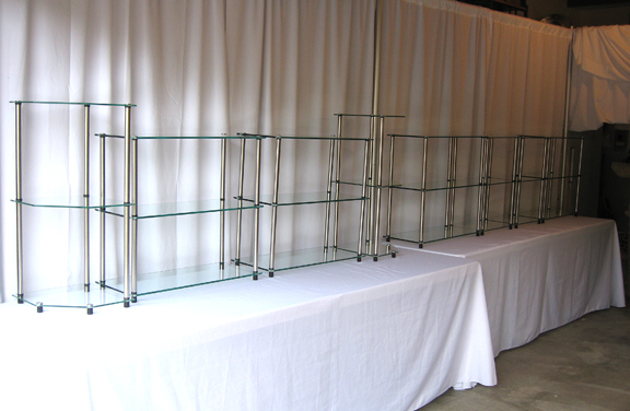 Cate, these are the shelf units I take for indoor and outdoor shows. This is the beginning of a set-up in my garage for an open studios event. I use pipe and drape, white table drapes (so I can stash crates of inventory under the tables) and these no-tools required glass shelving units. They're inexpensive, tempered glass, take about five minutes each to set up, and have withstood over 10 years' worth of shows so far. The taller units on the end and in the middle even have another shelf, to make them taller, which I haven't used in this photo.