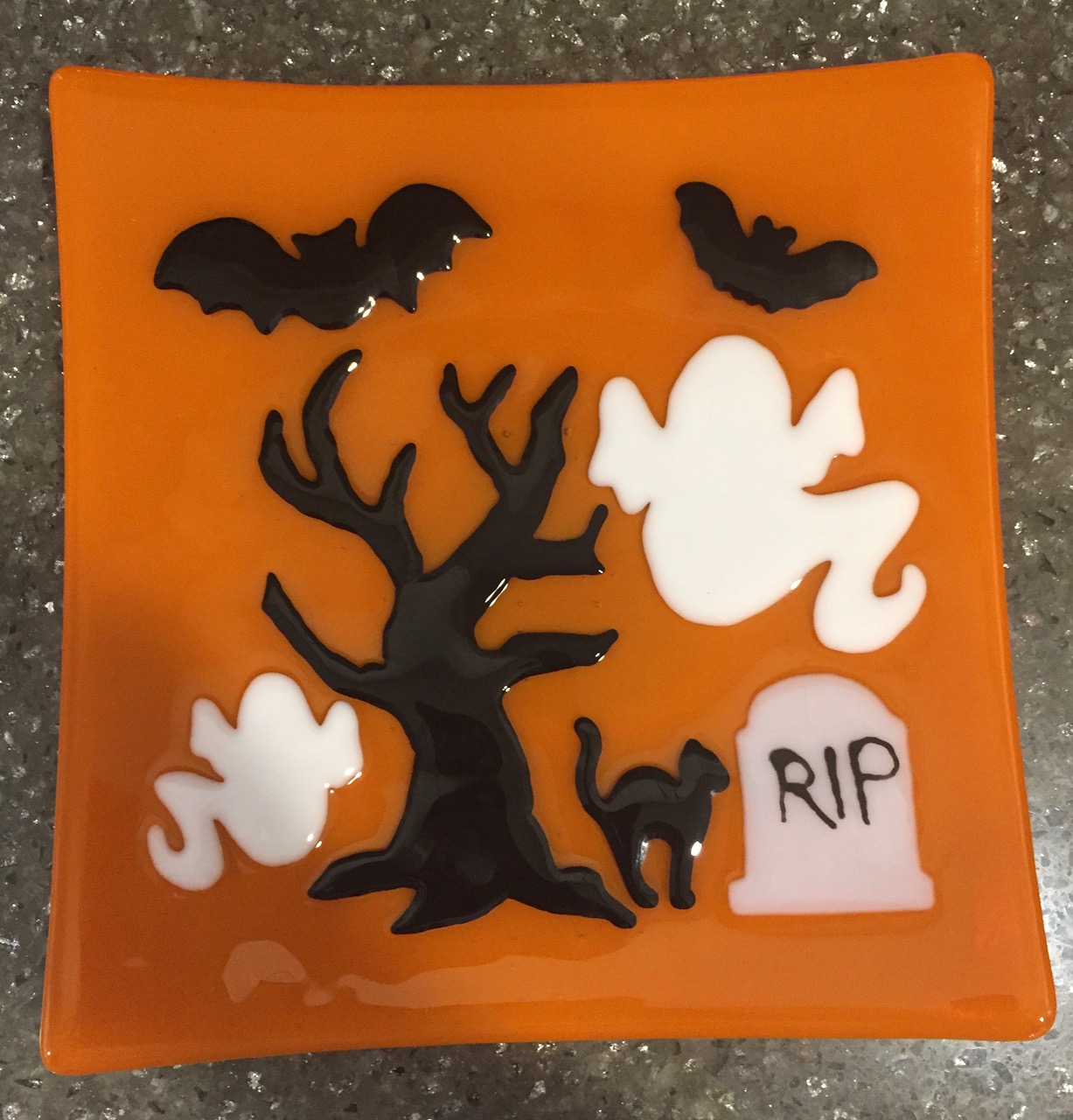 I'm new to glass fusing.I think this turned out really cute. I did used cutouts for the small bat and the cat but cut the others.