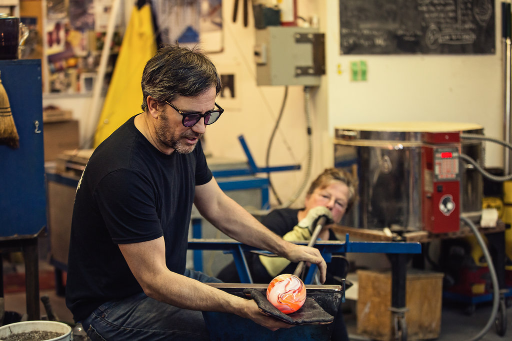I have really enjoyed getting back into the hot shop and Ryan Bavin just understands so well how the Bullseye Glass Blows out in large chunks and sections and how to maximize the interesting things going on inside. The important part is to remember what will actually be inside when blown out and what is on the outside when all is said and done