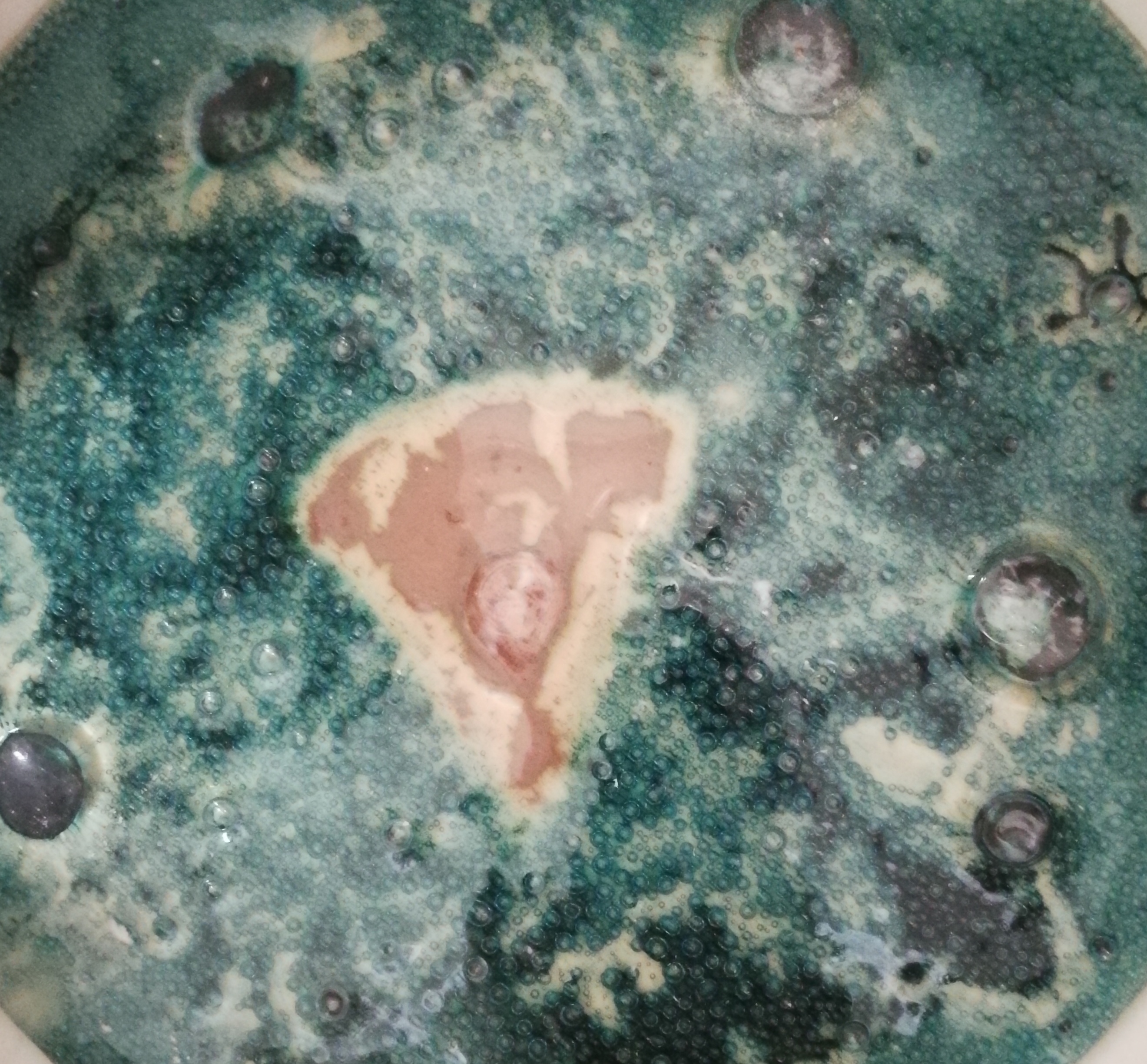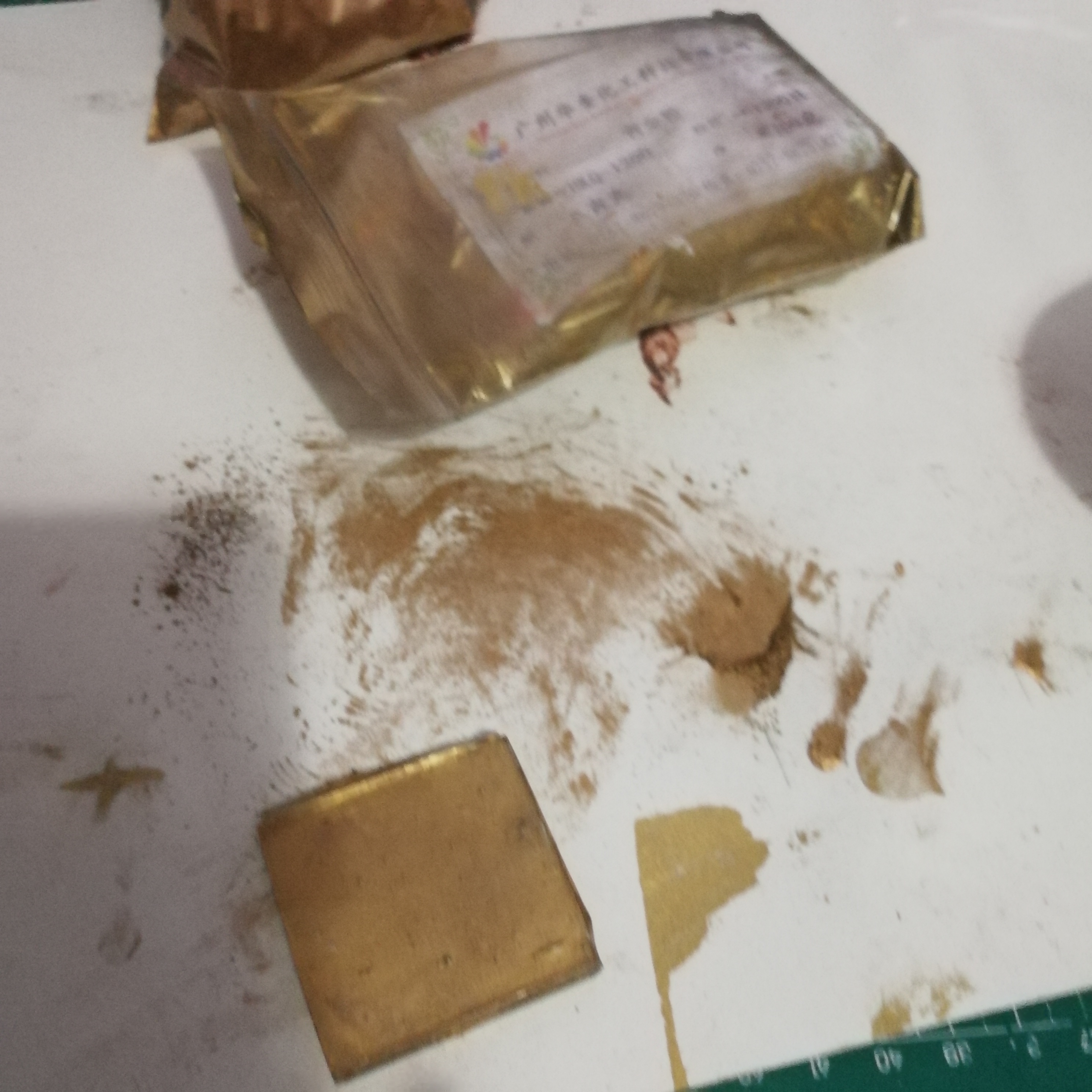 maybe it has additives but it's gold mica powder. did I not fire hot or long enough, is that why center stayed gold color? or the black lines is that from contamination with other powders?