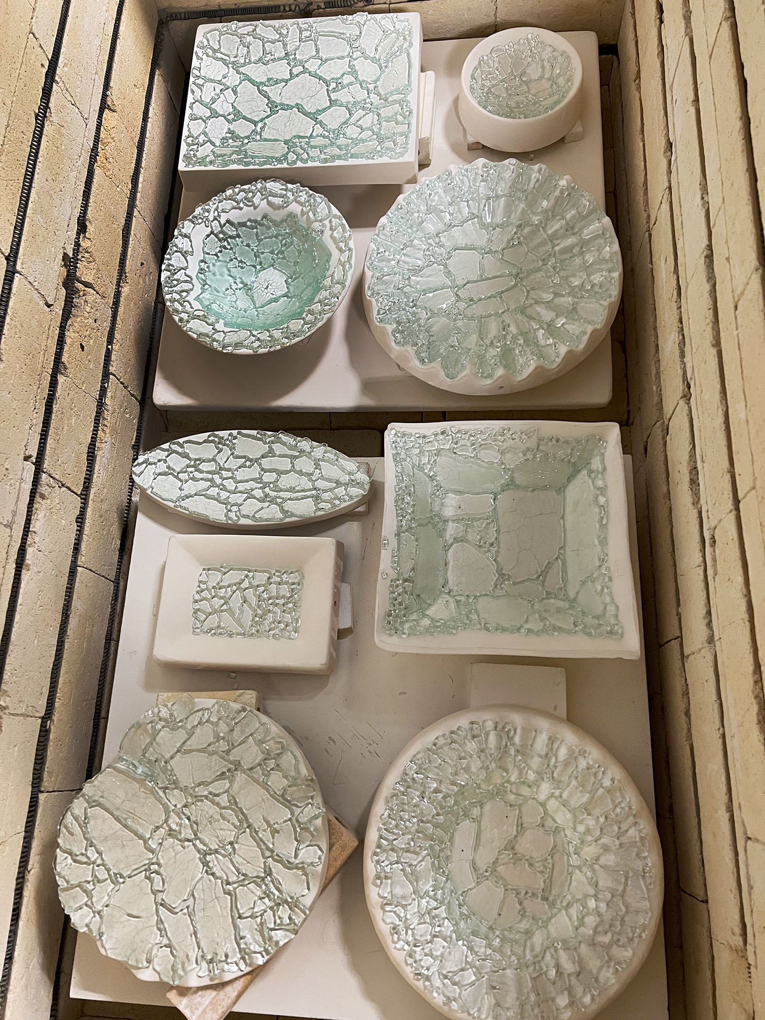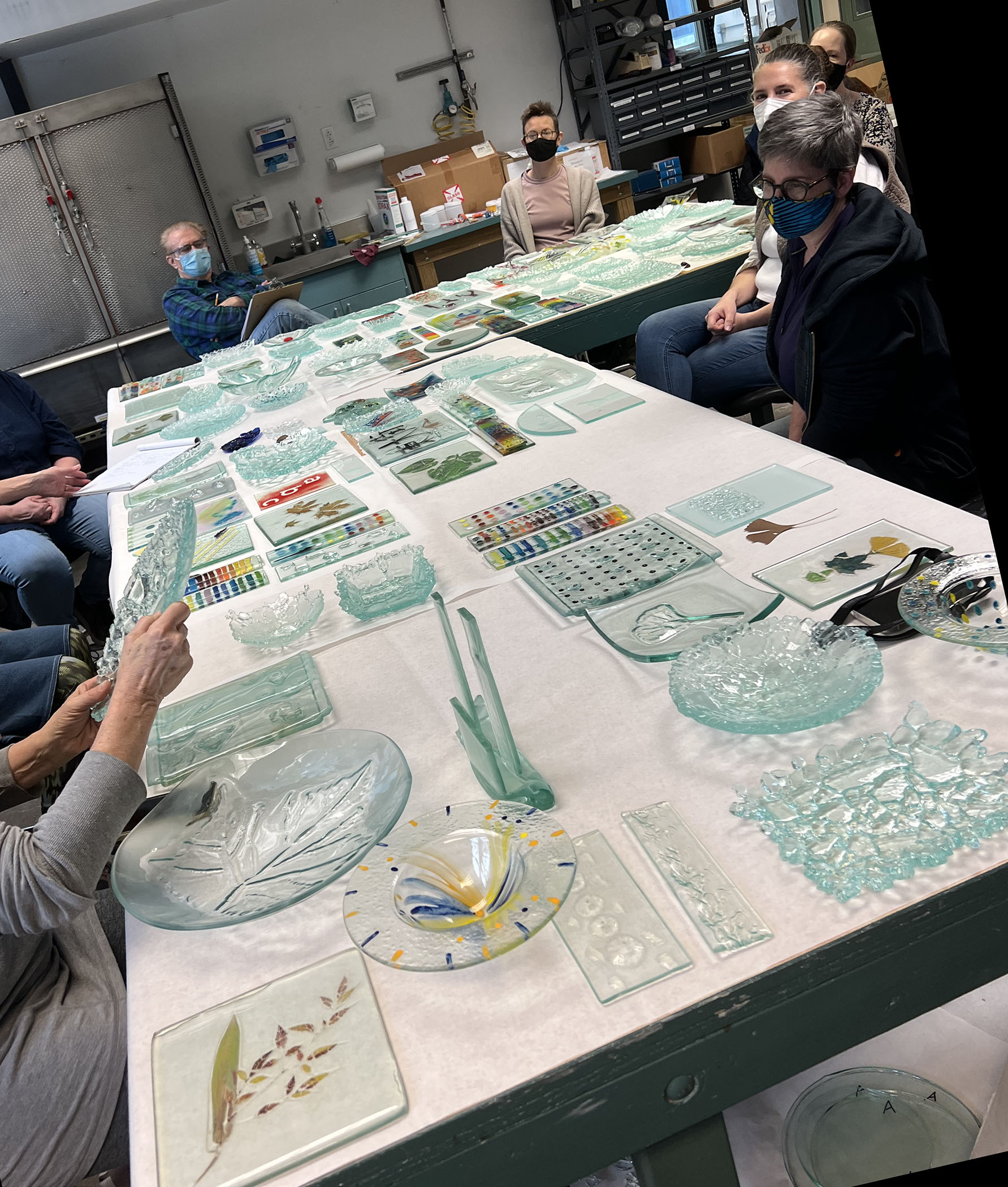 I returned from teaching a 6 day workshop in Corning last month. The Studio at Corning produced an hour long live stream video that shows a few of the numerous projects we did in class. It's now on YouTube. Thank you Bert, for your many years of sharing your tips on working with float glass. The tip using a screwdriver to tap out circles is a gem. In fact students have told me that that one technique was worth the price of a whole class. And Thank You Jody, for your wonderfully clear and informative publications on creating painted imagery with Ferro Sunshine enamels. They work so well with float! The students had a lot of fun and we kept all 10 kilns firing nearly every night.