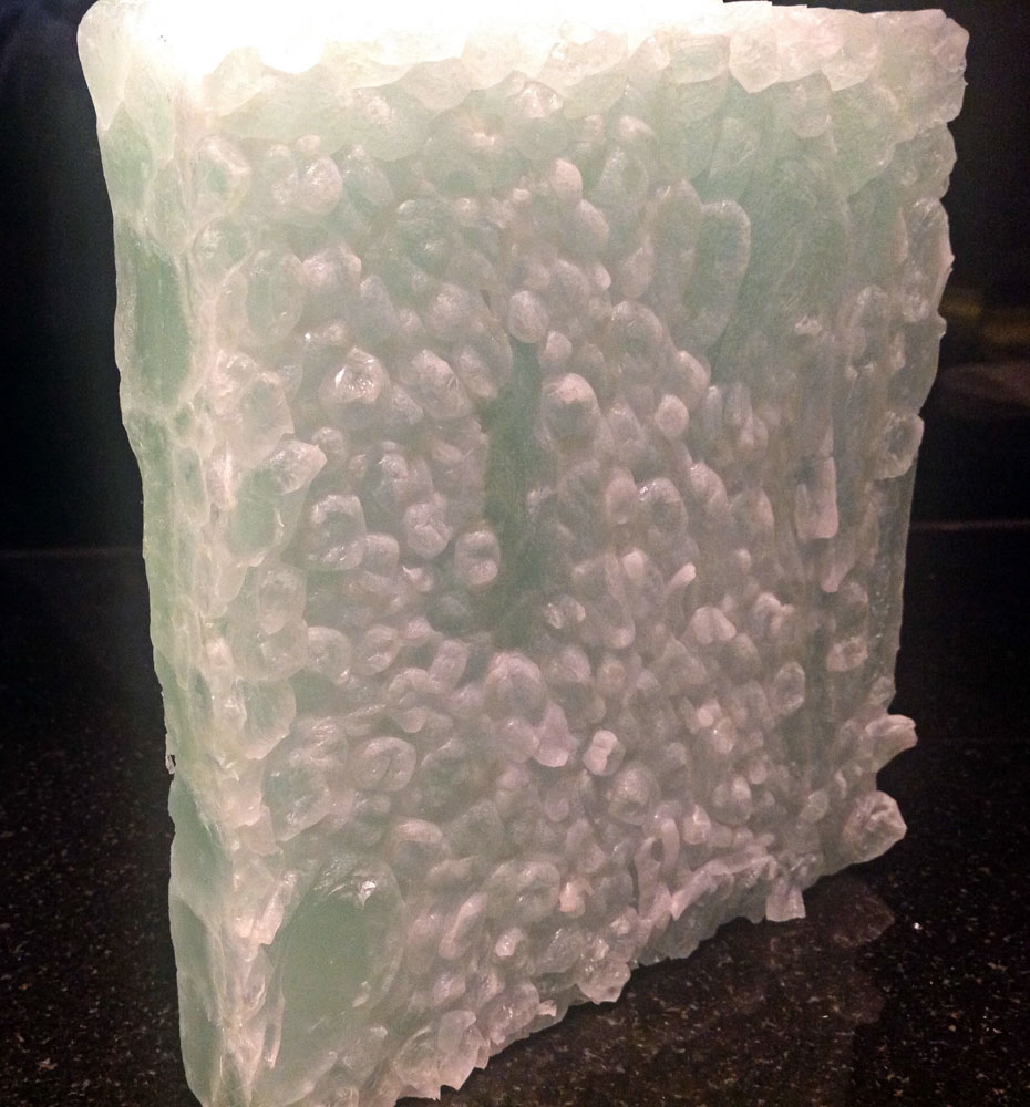 Most casting and fusing glasses are formulated to resist devit. Soda-lime seems more prone to it than lead crystal, opaque glass more than transparent, smaller particles of glass (frit) more than large, solid pieces, and glass in a plaster casting mold more likely than glass on a kiln shelf. Some brands of float glass are notorious for devit--I use devit to create lines and movement in some of my float glass castings: The whitish lines throughout the piece are devit. The back of the piece is dramatically devitrified: A light coat of devit really isn't a problem if you're grinding the glass to its final shape. It's a surface artifact. You just want to avoid an extended crystallation that would penetrate past the final surface you're trying to achieve.