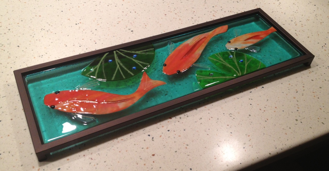 Fresh out of the kiln (which is why it's a quick iPhone pic from the kitchen counter) but using up some stands I've had for awhile. The photo doesn't show it but I combed a layer of clear powder between the base layers, which resulted in some nice bubble patterns. Measures 8x25".