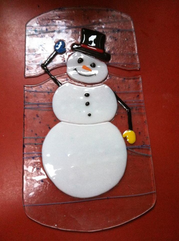 I had a surprise when I opened the kiln this morning.. this poor decapitated snowman... I am assuming this happened on the upside of the fuse as the edges are nicely rounded. The client wanted this nice cute little snowman tray and he ... well you can see what misery has befallen him...