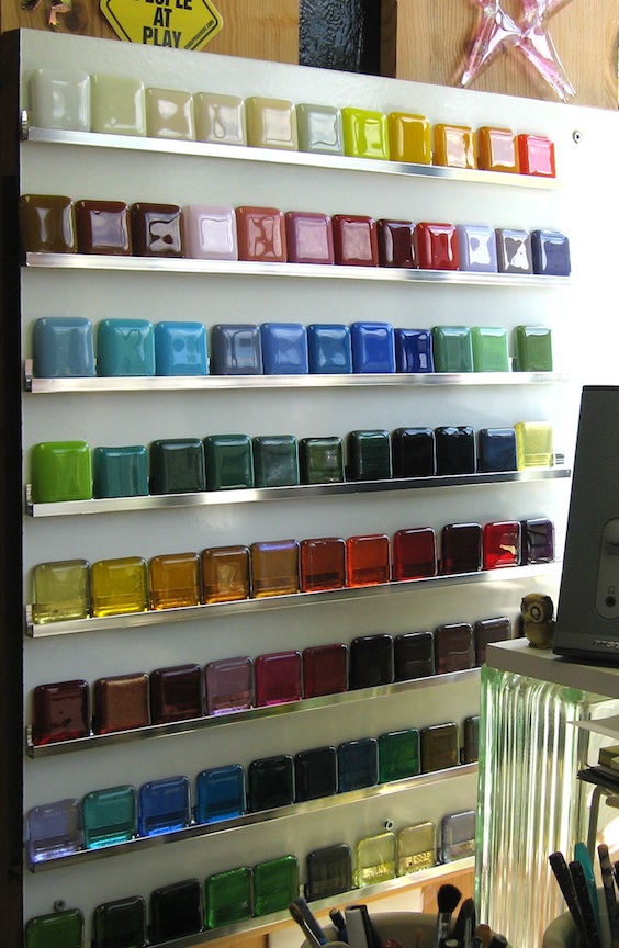 Yep, all of my samples are created this way. What I especially like about the rail system is that they're removable, so I can group them, compare them, etc. These are my most-used samples (at least for this week!) I have several other tiles, including my special production colors, in small trays like photo slides are stored in.Morganica wrote:If you are making test tiles, fire them with your most frequently used schedule (or the schedule you're planning to use on the piece you're testing for) at least on the up ramp and process temp.