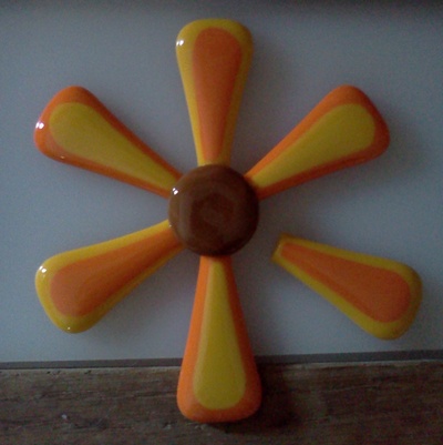 I was hoping someone could help me out with a problem I'm having. My mom wanted me to make her some little thinks to stick in her garden. I was just going to do simple little flower type things, kind of like Spectrum's "Spirit Flakes" that they have on their site. I took two triangles, one small one large, of sys96 for the spokes and full fused them together. I used 2 1" squares fused to make center circles. I was pretty much just using them as filler for my kiln while I was fusing other pieces.