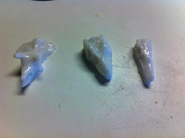 I'm trying to use freeze-and-fuse to make little dinosaur skulls from silicone molds I made myself. The ice cubes came out fine, but when I fired them according to this cycle (http://fusedglass.org/downloads/schedul ... hedule.pdf) they came out all slumped over on each other. These are made from System 96 recycled frit.