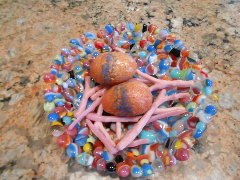 I used plastic eggs and did the freeze and fuse technique. Once out of the freezer I tried to smooth them a little more and rolled them in some glass powder.