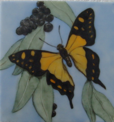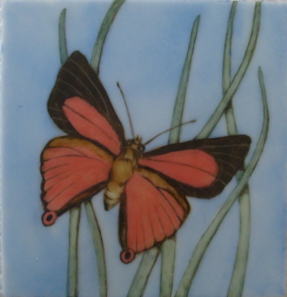 EDIT: Just looked at my notes: Sky and leaves are Josephine other colours are Fay Good. Yellow butterfly has Reusche bistre brown, stencil black and tracing black border detail in wings, fired 1 hour to 1200℉, 5 min hold off. Enamels fired 1 hour to 1080℉, 5 min hold, off.