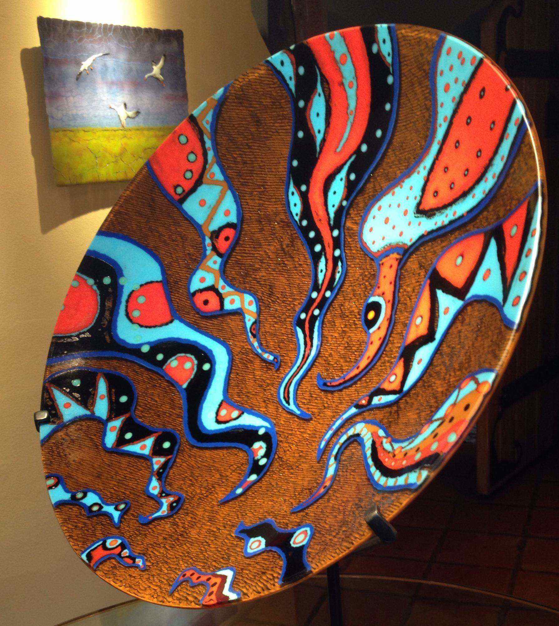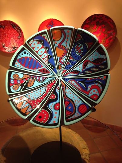 Two new bowls, both are 22 inch diameter, system 96 glass. The turquoise and black one (lower bowl) has an irregular edge, made by placing 10 large powder wafers on top of 10 turquoise green slices of glass (shaped like pizza slices) Then those ten "slices" were placed on one large single layer of black glass. The black glass pulled up between the "slices" giving the piece a scalloped edge, no cold working. The brown and turquoise bowls was also made with powder wafers, with a cold worked edge,