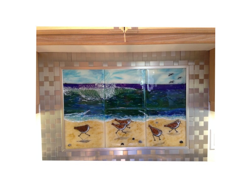 What a cheerful scene to have in a kitchen. I would be interested in knowing how it is mounted. Is it over top of the stainless that is behind the cooktop or did you leave a space for it and add the stainless around it? You did a very nice job of matching up the separate tiles!
