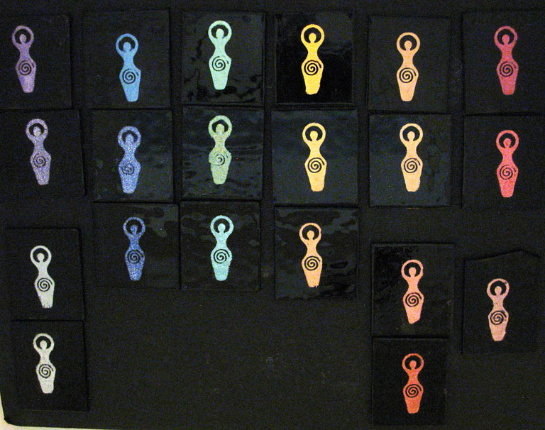 Second, we apply the micas onto screen printed (and still wet) Kaiser Glass Paints of colors similar to the mica. We use blue base for blue, purple and sometimes green.