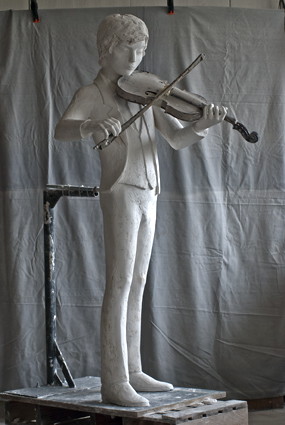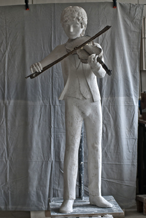 Here are 2 pictures of the plaster model of the sculpture. It is a life size figure of a young boy - 1.55m tall. Most of it is to be bronze (already cast) and the head, the collar of the coat, the waistcoat and the shirt are going to be glass.
