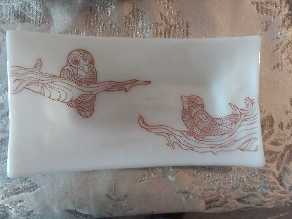 A light hand polishing with cerium oxide and a cloth will usually remove any haze from the decal base(usually a plant starch). Sushi dish made with line art by my daughter.