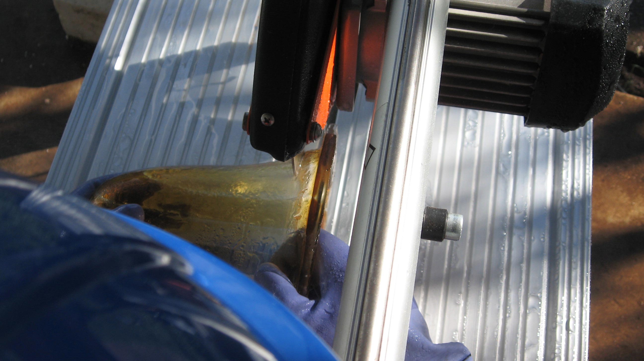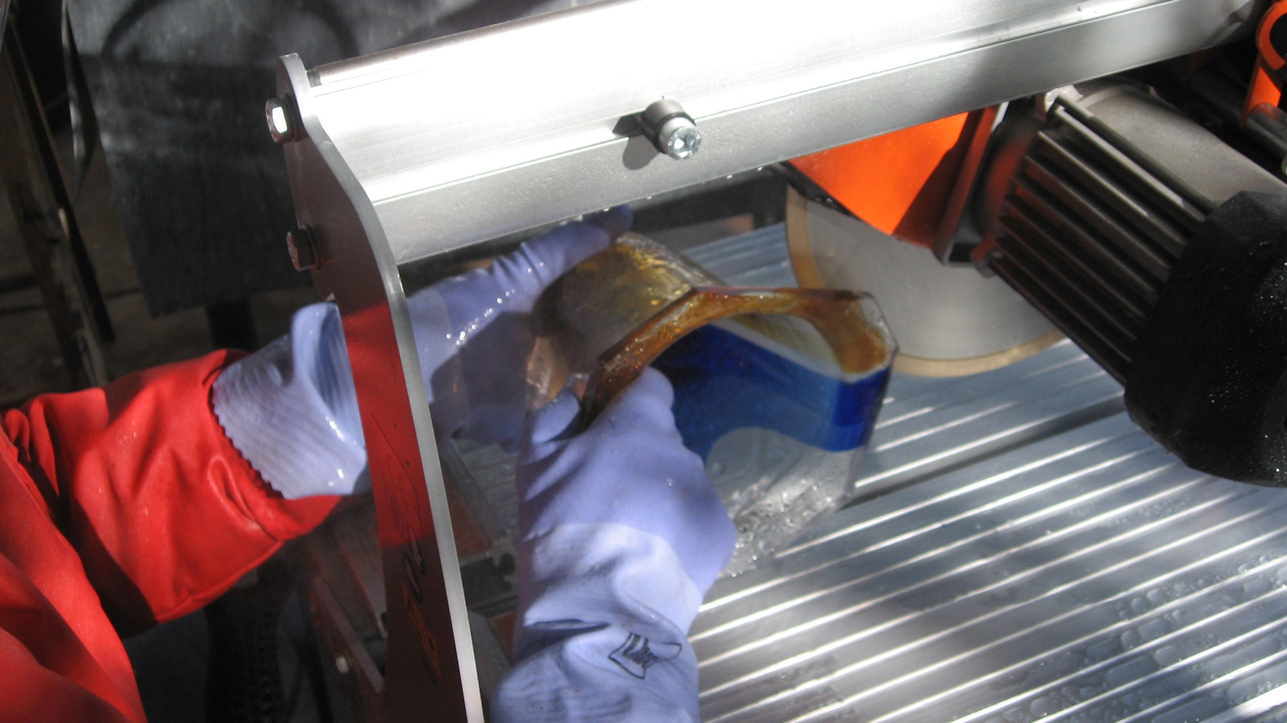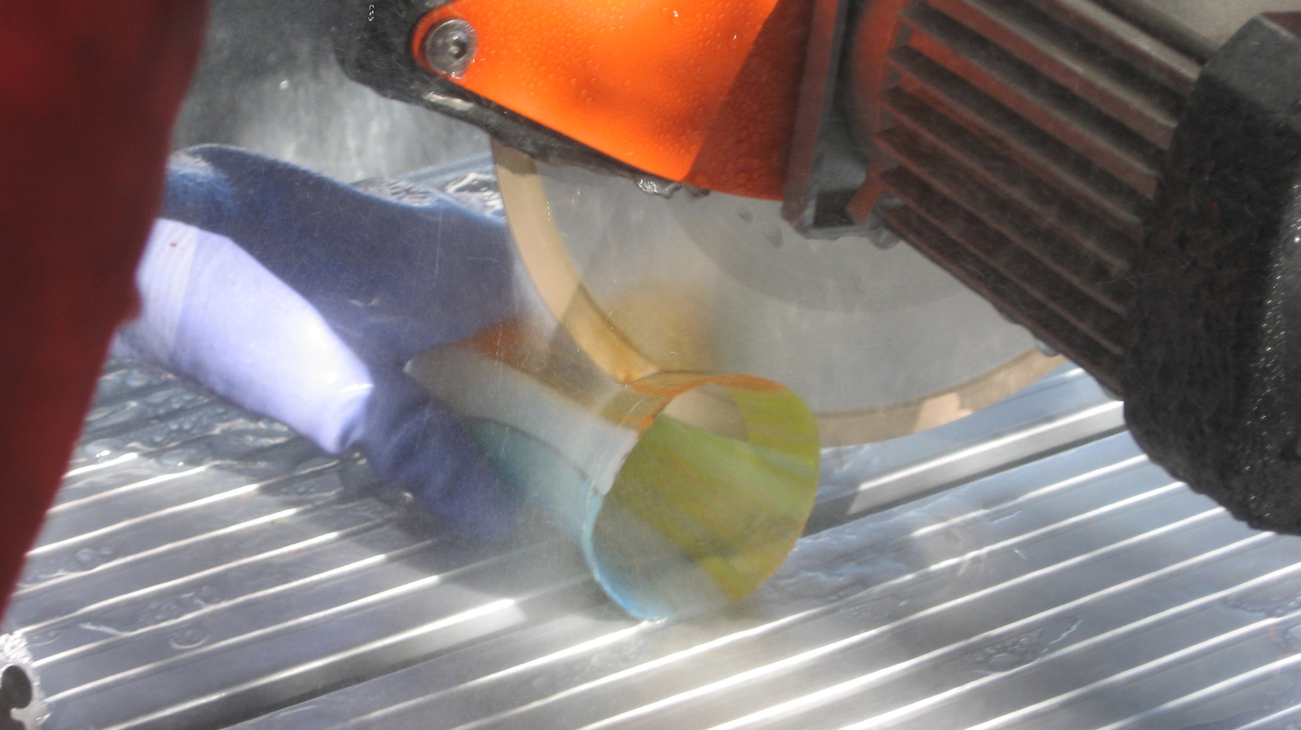 We have a railsaw, (we actually bought it for tiling our floors) and I've bought a thin kerf diamond blade for it., Do you invert the vessel so the flange to be removed is flat on the deck of the saw, push it into the blade while turning it, or do you hold the vessel steady, slice off a section, reposition and take off another slice then finish by grinding or do you somehow hold it on its side and freehand the cut?