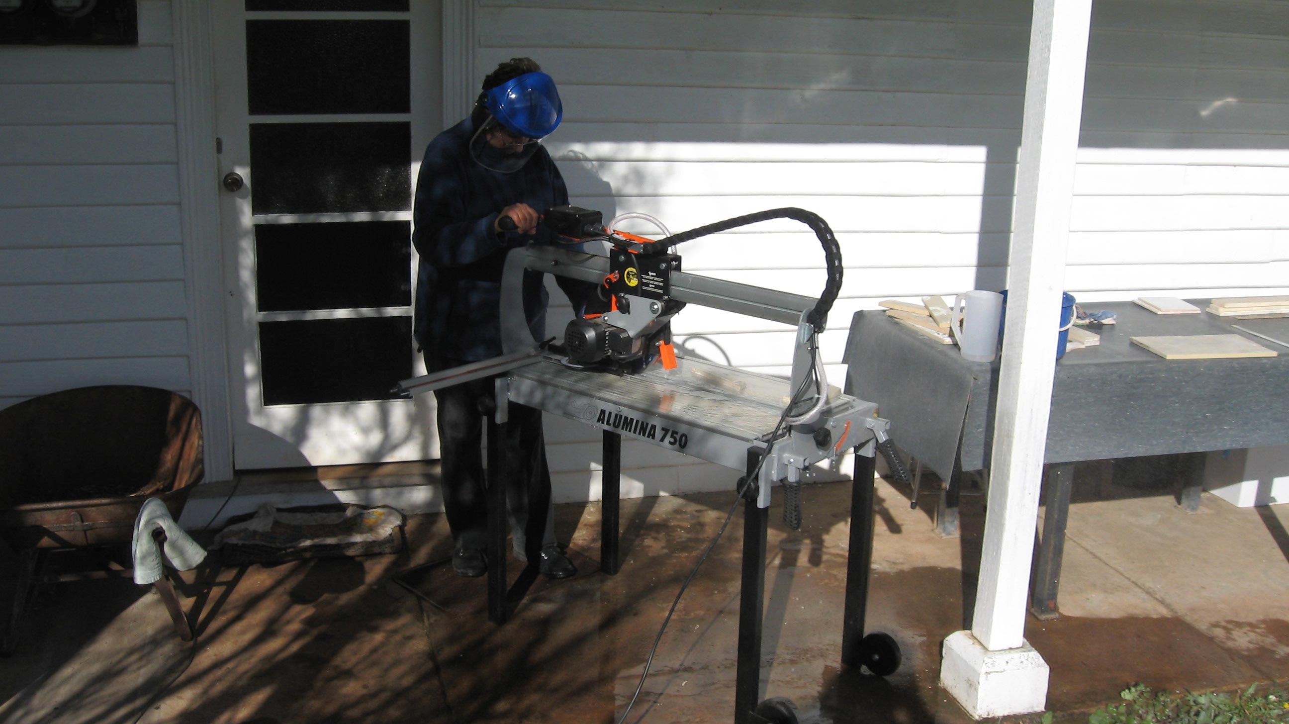 Here is a picture of my tile saw, first practicing by cutting some old shelves.