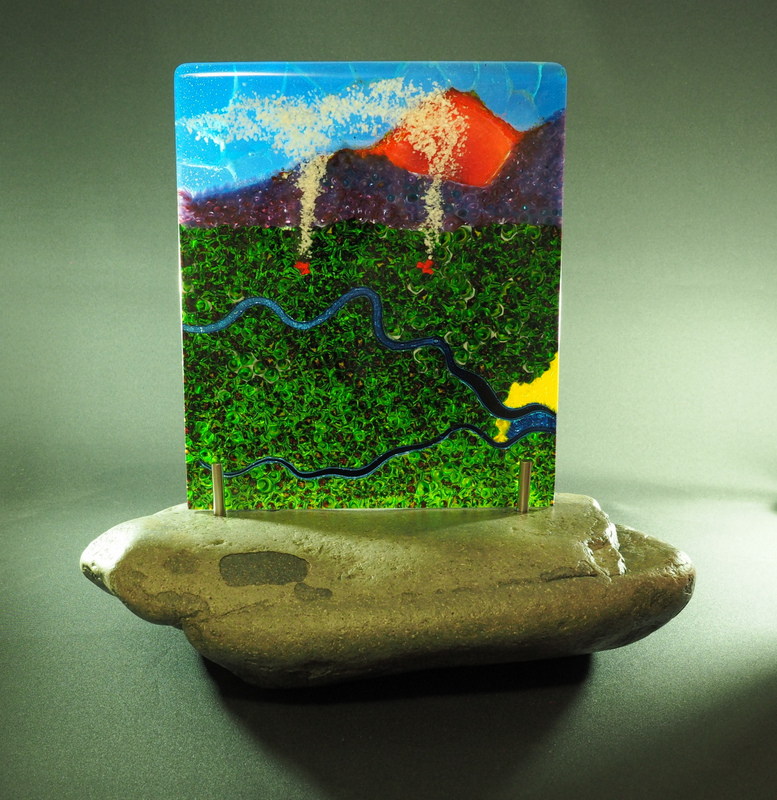 I really appreciate your attention to detail such as the smoke rising from the lava flow where it is encountering fresh vegetation on it's downward path. The closeup of the lava shows how realistic it's texture is. Don't know how you managed to get it so different from the apparent texture of the surrounding area. I'm intrigued by the construction of the piece and the different processes you must have used. Quite a perfect rock too!
