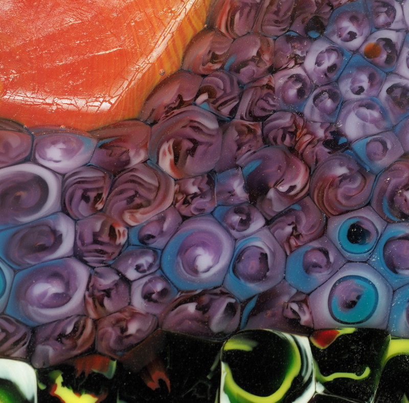 Thanks Vonon. The difference you see in the close up is of a mini aperture pour with layers of clear and clear irid on top nestled among a grouping of murrini. Had to be capped to give slightly higher height than murrini to counteract too much flow of elements. I was going to let you go with the idea of it being lava as the beach near here does have old lava flows. The fires are cane fires just beyond the mangroves. These fires are getting rarer as machinery is adapted to cope with bad stands of cane. I have a thing about cane fires as I lived directly opposite cane fields as a child. A piece made in 2003 was a closeup of one and one bloke with dutch heritage would see a tulip. He'd see it often as a customer to our cafe, always as a tulip. Who knows he might buy a tulip. - haydo