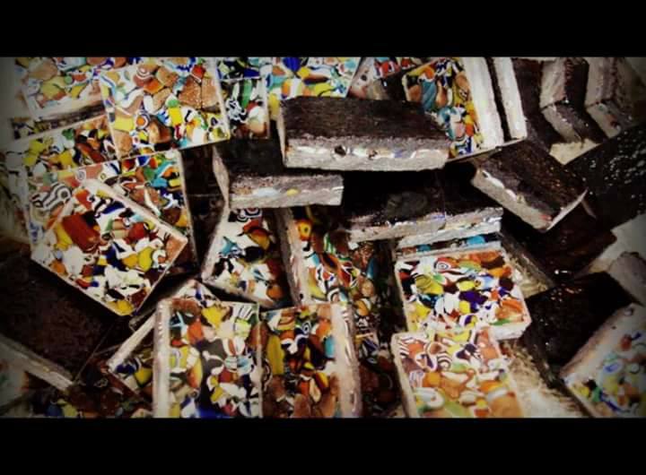 I use murano glass. I make plates in first firing, then i cut in small pieces with dish saw and the edge stay rough