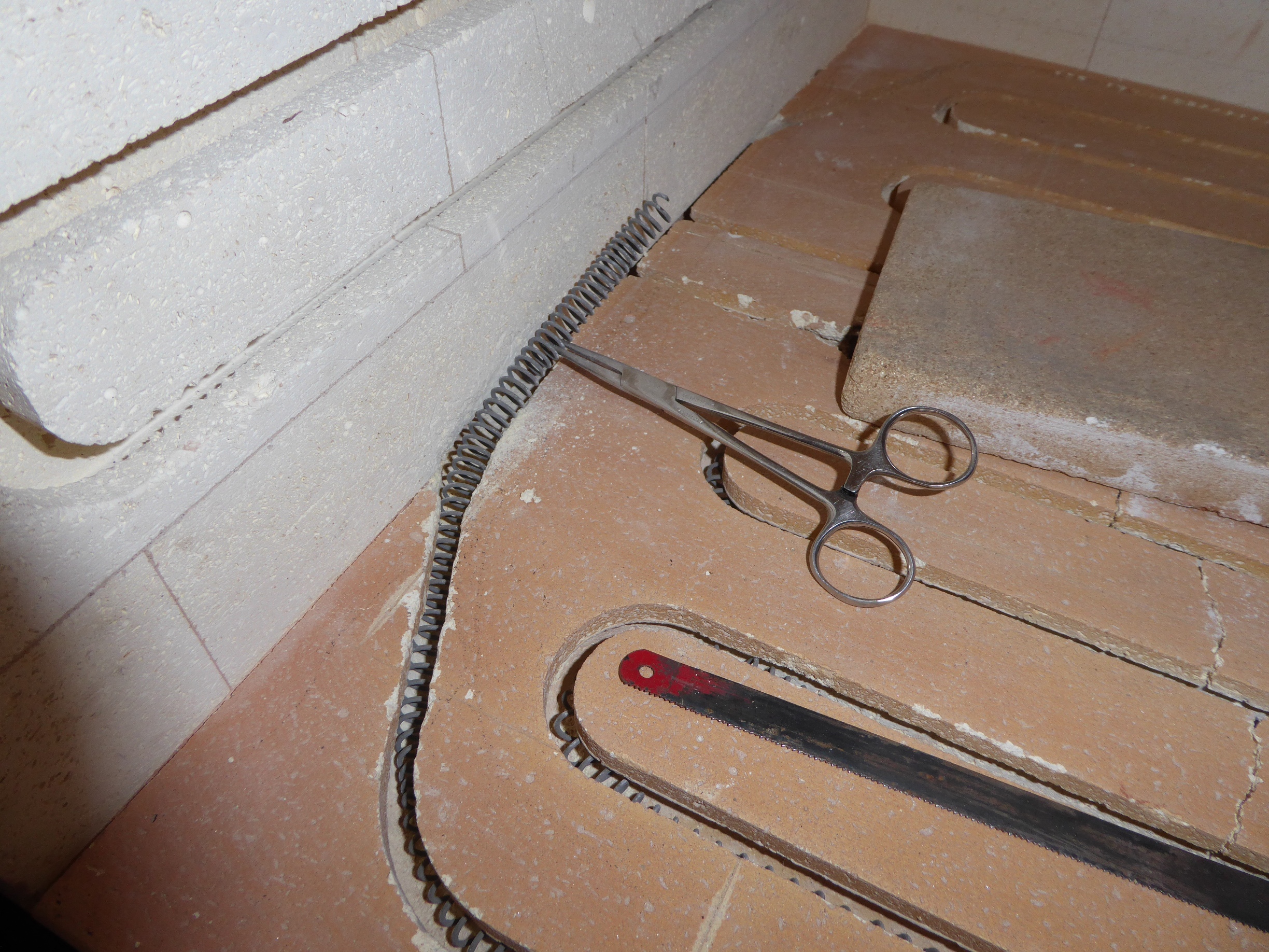 Remove the door (optional) and turn the kiln upside down so that you can work on the roof from above. Note that the firebrick are a bit fragile, so it is helpful to have a piece of plywood to rest your forearms on while you work to prevent localized pressure from breaking the firebrick. Remove a bit of the insulation (hacksaw blade) at the wall edge where the elements pass thru the wall (see photo). You need this additional room to remove and install the elements. A pair of 6" to 8" hemostats is useful (required) to remove and install the elements without unduly beating up the firebrick. Assuming you have to remove the old elements, cut them in segments with a Dremel abrasive wheel and carefully "worry" them out. With the elements out, make any necessary repairs to the fire brick so that when the new elements are installed, they won't fall out of the groove.