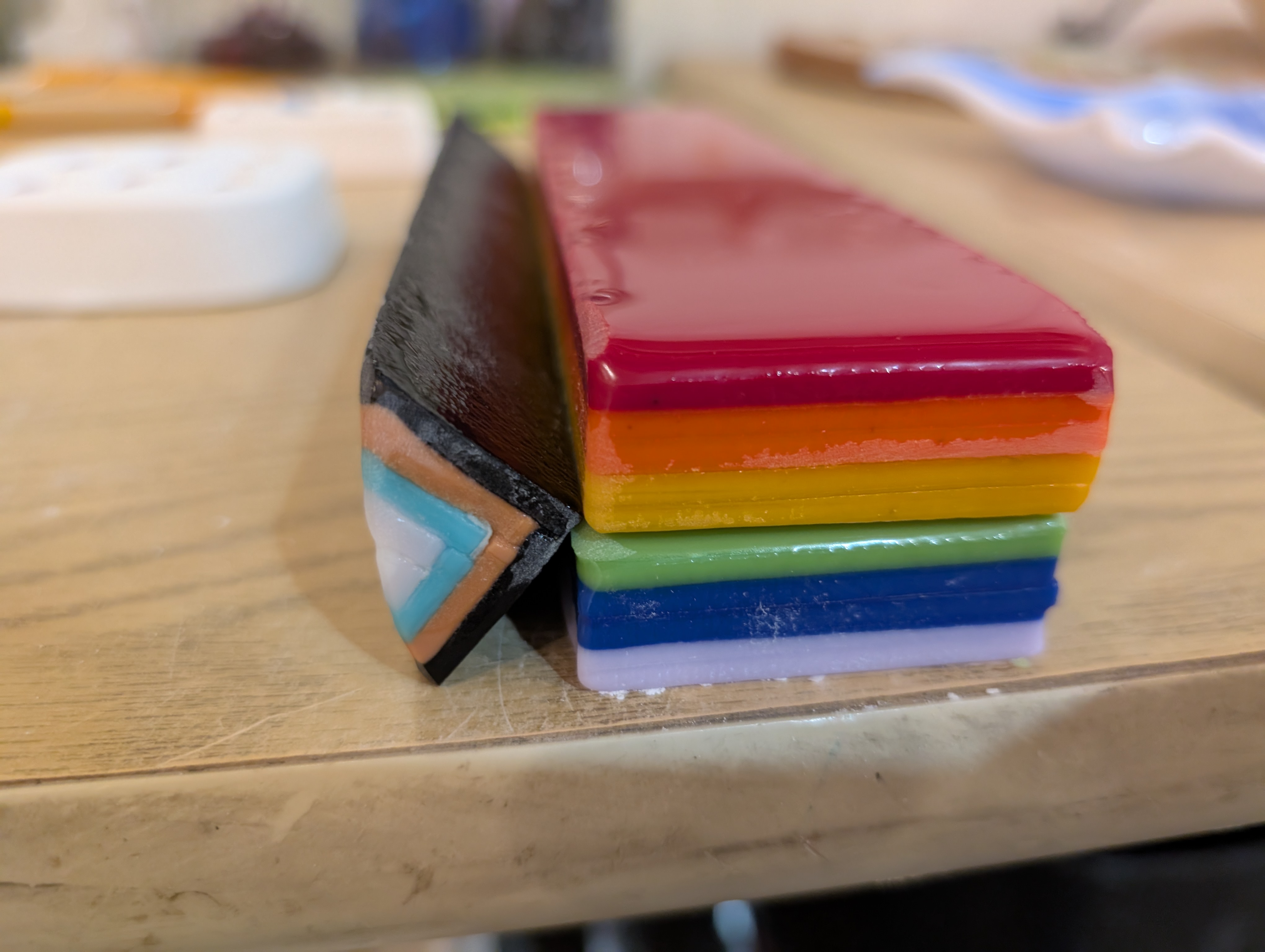 The horizontal stripes are 2 inches wide, each 3 color block is 6 layers of 3mm glass high, and they're ~8 inches long. I'm going to turn the stipes vertical and then put the triangle in the cutout then fuse again. Right now the plan is triangle on top but if someone has feedback on that, I'd love to hear it.