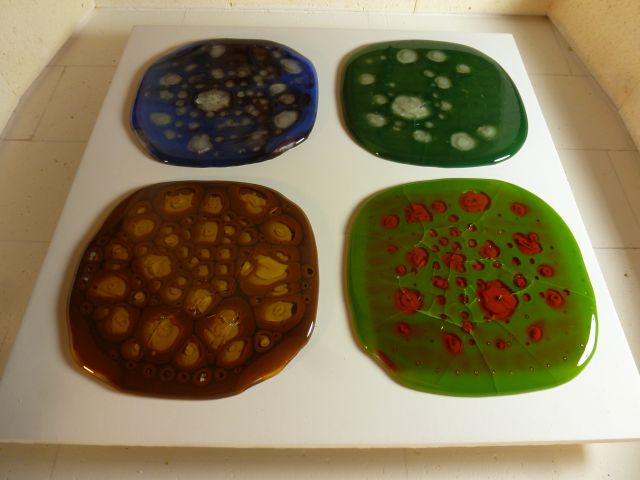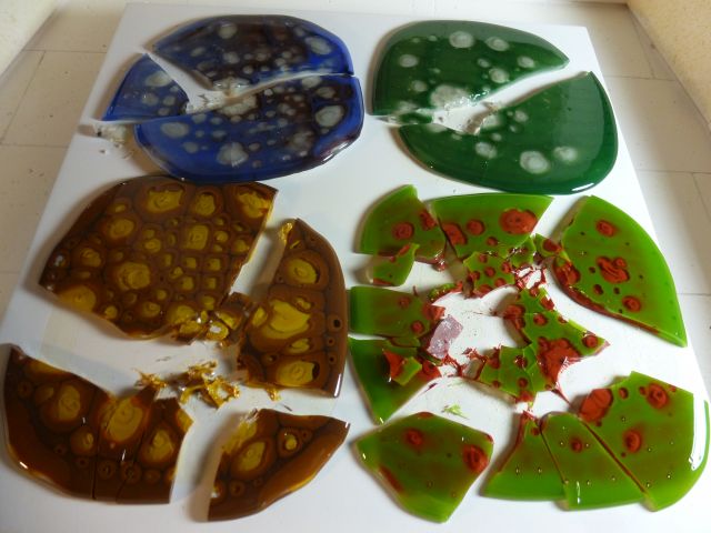 Two bubble-up firings. The first is fine and was slumped into a plate. Next was 4 smaller pieces on the same schedule. All have multiple cracks. The cracked one in the lower right is even the same glass. What happened?