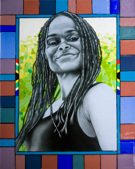 By the way here's a step-by-step for Gita. I photographed her recently at a tipi celebration. I started with light blue glass trying to capture the light refecting on her face The brown color is Persian red over the blue. The devise on either side of the border is the flag colors of South Africa since that is where she is from.