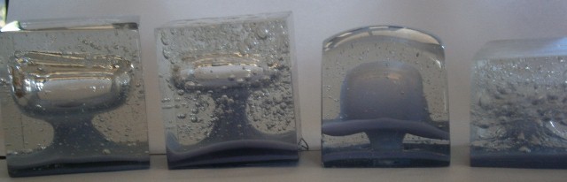 I made glass sculptures kind of cast - fused pieces. Between 2 to 2.5 " thick, So that the bubbles will really show. I wanted to show that what might be cosidered 'bad', can actually be exciting and supporting of the design.