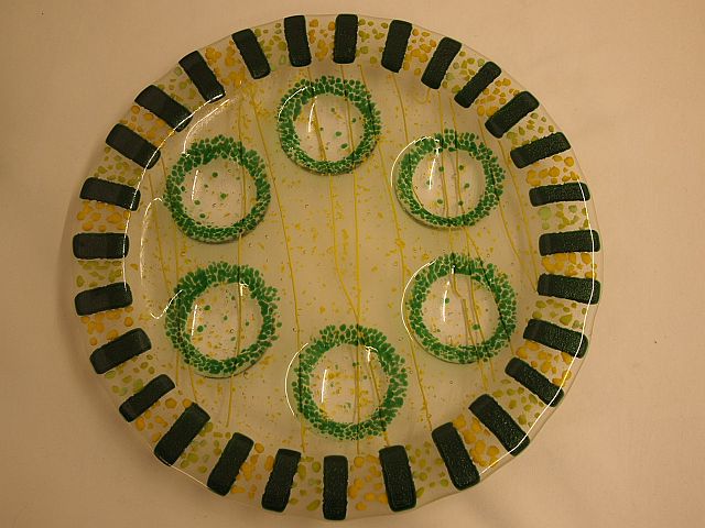 I had some 2" square conglemerations that were intended to be magnets for my office mates, but they turned out too large. I didn't know what to do with them, and I don't like to waste... So, I decided to try to center them over the seder plate cups (not so easy, even with my tracing because I decided to use a white blank under the amber transparent. I wound up measuring the jockeying the plate until I thought the design lined up with the cup centers. The design pieces had a tiny bit of devit from the original firing (or was it the 2nd firing), so I brushed a layer of Spray A on them. Plus, there will be (unappetizing) food in contact with the glass, so I thought that would add a safe layer. The extra little pieces were cut from a pattern bar (Patty Gray class in Fort Myers) and fused again on their side to add a little interest. The cups are quite well formed. The blanks were 11.5 inches and the finished plat is 11.25" (Did I measure wrong the first time, or did the slumping process drag everying in/down??).The thing weighs a TON - a bissel (little) over 3 lbs.