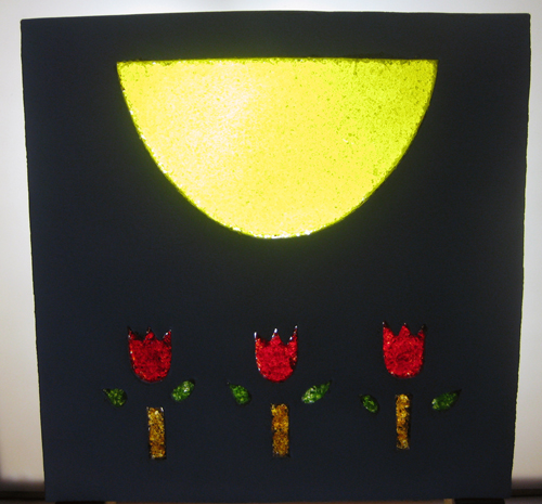 here is a tile that I made using terra cotta and glass. 30cm x 30cm x 25mm