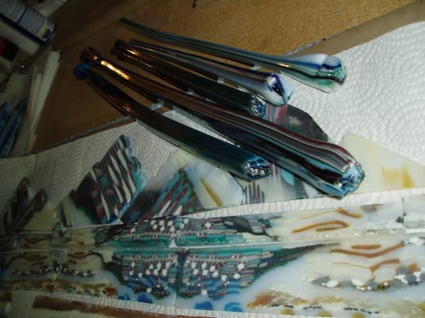 I am happy with the pulled cane at the hotshop we did. Now to fit them into the design with out wasting them. Hmm :-k Well definately going more abstract.