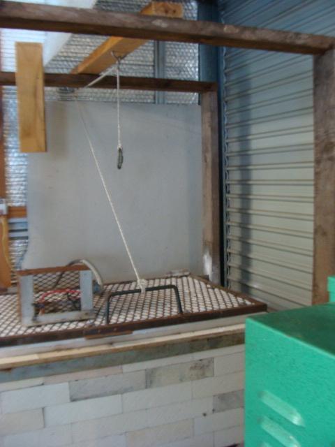 Very tidy! I'd have preferred not to have the wood frame but it was necessary because my workshop is corrugated metal so putting a hole through the wall is not a good idea. Also, the kiln will eventually be repositioned when the workshop is extended so the frame can go with it. The walls will still be metal. There currently isn't room to pull the kiln forward enough to make room for a counterweight that won't interfere with the thermocouple. In the last workshop the rope went up to a low beam. Jen
