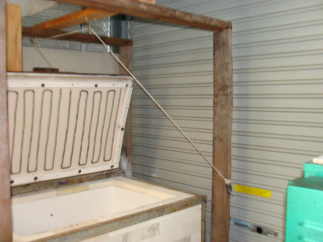 The framework was hastily erected from material we had around, 2x4's from concrete forming. The short vertical board is there to stop the lid going right back and smacking into the sending unit which is mounted on the wall behind the kiln. If I want to quickly peek in then I just raise it enough to see in without fully opening it. Hope that helps.Jen