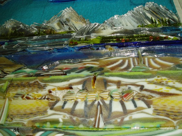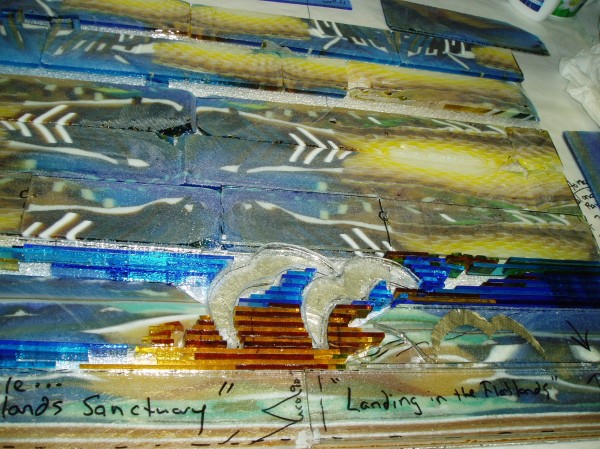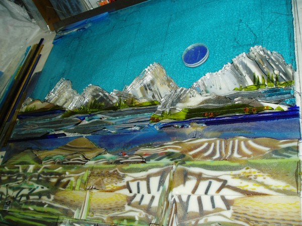 One of 5 panels to be created at Uroboros Glass Company Residency in July! More layers of clear to go on this but transporting layers of cut pieces and the finished cut panel is a trick in itself. Had to get a PaPs Manifest done tooo so going over the border will be alittle easier this time I hope. I just wish it was not so hard to get into the USA but hey! my motto is do not sweat the small stuff. So off I go to finish the other panels before I arrive there as time will be short to fire and then slump this piece called: "WETLANDS SANCTUARY" . Look so forward to seeing a few of you while in Portland too! Leslie