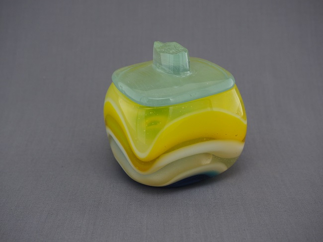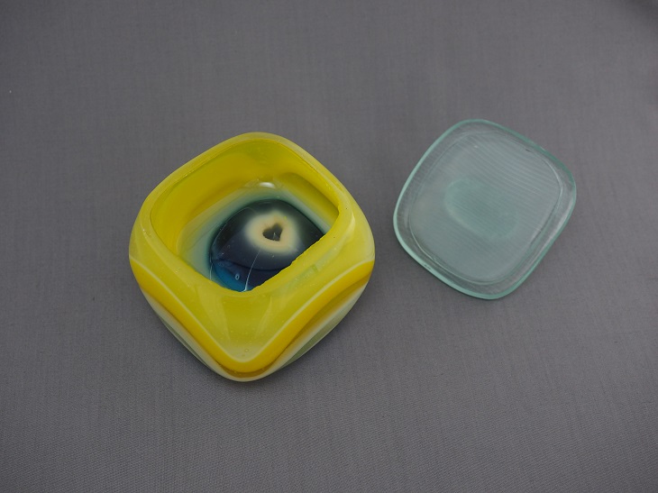 Finally found the time to finish off something for a friend. The lid is made from thin strips of float laid into an open mould dug into a kiln brick. The body of box is a failed bubble block ground to shape and polished. Not keen on waste so was happy enough to put the hours in for someone who's been there for us. peace, haydo