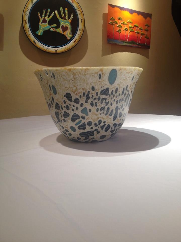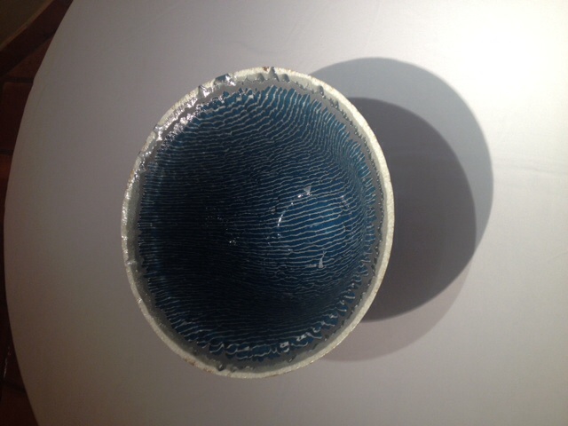 This piece was done with stringers and frit and one piece of steel blue sheet glass. If you look at the rim you can see the steel color.
